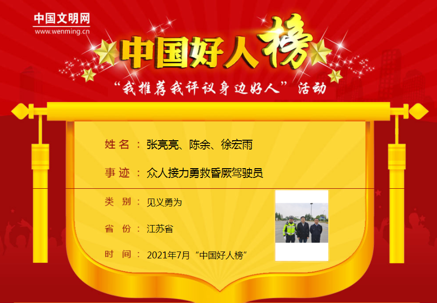 近日,中央文明辦發(fā)布2021年7月“中國(guó)好人榜”,其中,宿遷交通集團(tuán)徐宏雨入選見義勇為“中國(guó)好人”。